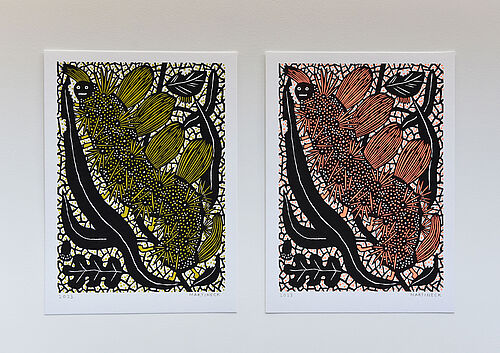 Die Jahresgabe wurde im Jahr 2022 von Sophia Martineck, Professorin am Studiengang Kommunikationsdesign und Medien, insbesondere Künstlerische Grundlagen, insbesondere Zeichnen und Illustration erstellt – Scherenschnitt und Siebdruck.