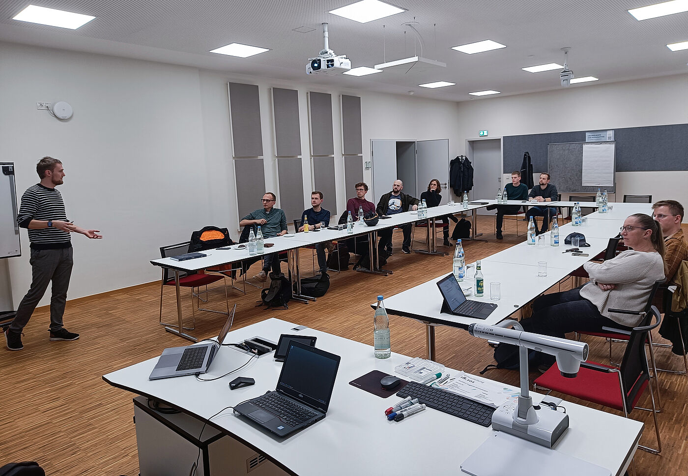 Mehrere Personen sitzen in einem Seminarraum an Tischen und hören einem Vortrag zu. Einige machen sich Notizen, andere blicken auf den Bildschirm mit der Präsentation.