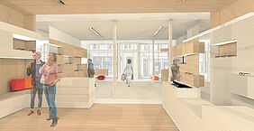 Dieser Blickwechsel wird durch ein Modul innerhalb des Raumes aufgegriffen, dass verschiedene Funktionen übernimmt: es ist die Präsentationsfläche für Brillen, sorgt für Stauraum, bietet Beratungs-, Ablage oder Sitzflächen und integriert Spiegel. Demnach übernimmt das Modul alle wesentlichen Nutzungen im Raum und ist zum sitzen, stehen oder schreiben geeignet.