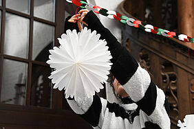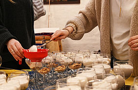 Bereits ab 8 Uhr morgens verwandelten die Studierenden die Winterkirche in einen festlichen, warmen Ort. Die gesamte Dekoration hatten sie im Vorfeld selbst angefertigt – neben ihren regulären Lehrveranstaltungen. Papiersterne und Lichterketten schmückten den Raum, auf den Tischen standen kleine Papiertannenbäume, bunte Sterne und Schneemännchen. Für jede Besucherin und jeden Besucher lag eine Weihnachtskarte bereit. Die Tische waren festlich gedeckt, die Winterkirche strahlte eine besondere Atmosphäre aus.