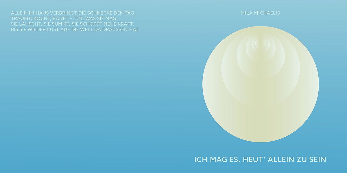 In dem Bilderbuch „Ich mag es heut‘ allein zu sein“ wählt Mila Michaelis (KuM) die Schnecke als Metapher, um den Prozess einer kontemplativen Ruhe- bzw. Rückzugsphase in ruhigen, farblich sehr zurückhaltenden abstrakten und dennoch sehr poetischen Bildern und Reimen zu beschreiben.