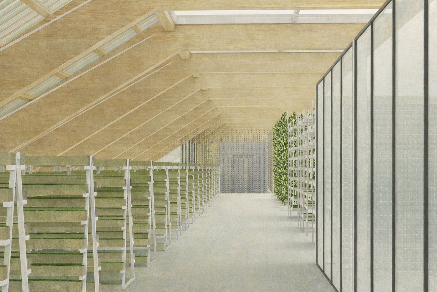 Cultivation is exposed and spatially articulated. Through visual connections and sectional relationships, processes of growth become visible within the public realm, allowing the building to act as both productive machine and medium of awareness.