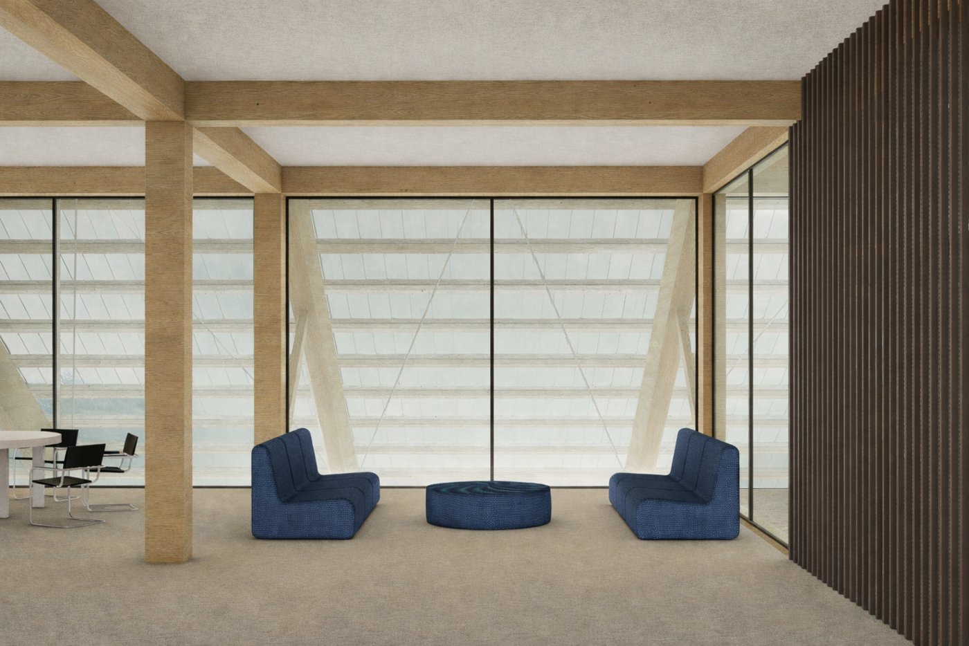 The building is structured as a wooden skeletal framework: a permanent spatial order capable of change. Within this open system, adaptable volumes and programs are inserted, allowing flexibility while maintaining a clear architectural identity. The skeleton defines the architectural grammar; the infill remains variable.