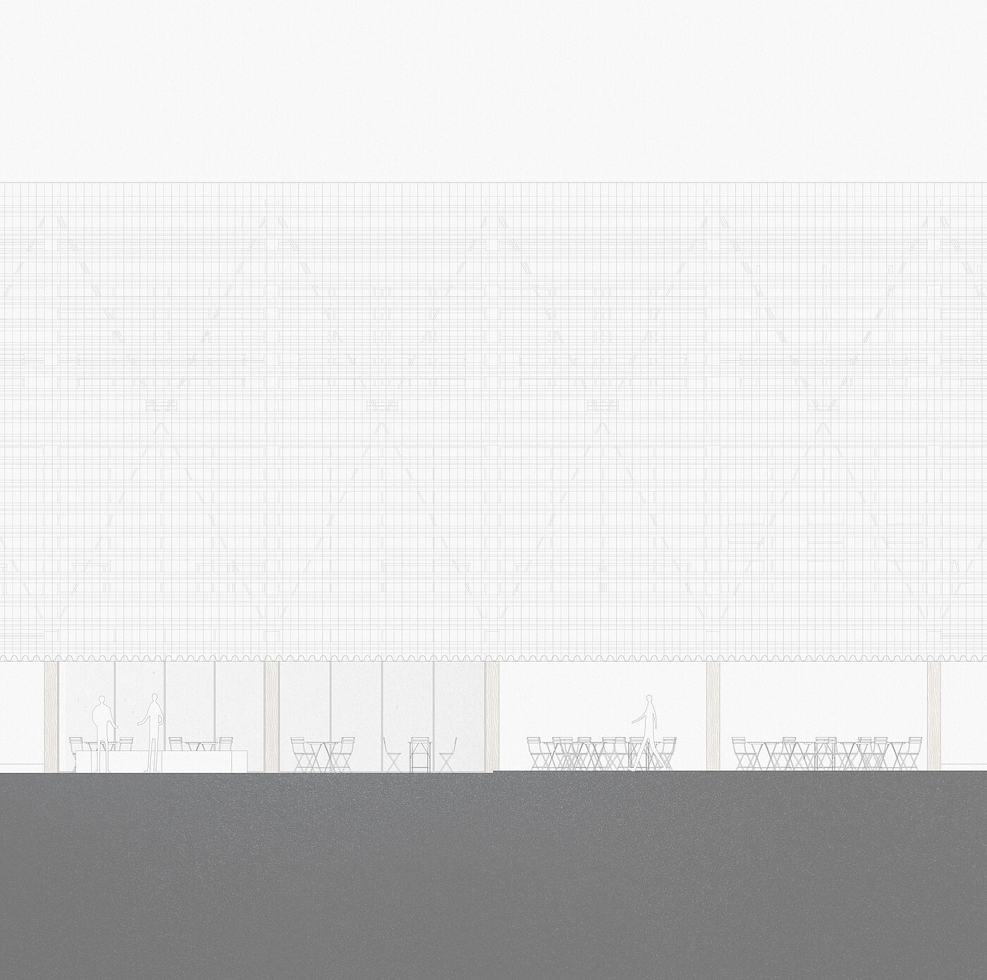 The project is vertically layered from public life to controlled production. The permeable ground floor acts as an urban passage connecting everyday activities and food culture. Above, production, logistics and education form a communicative core. The uppermost level is dedicated to cultivation, conceived as a greenhouse and environmental apparatus.