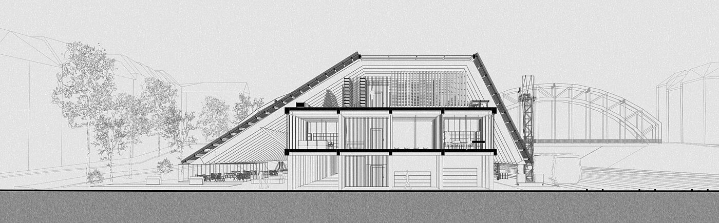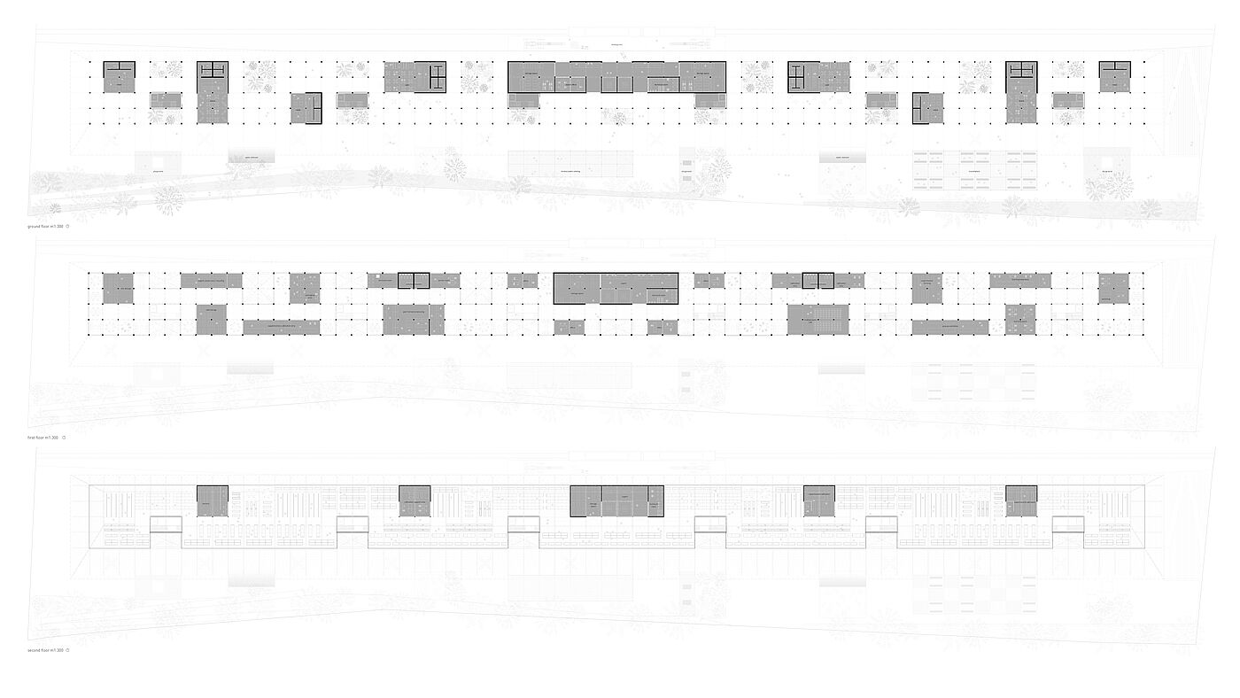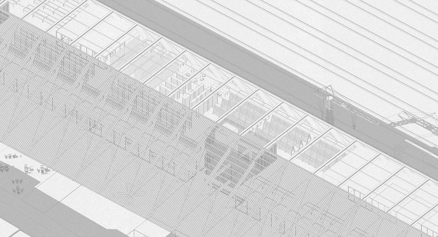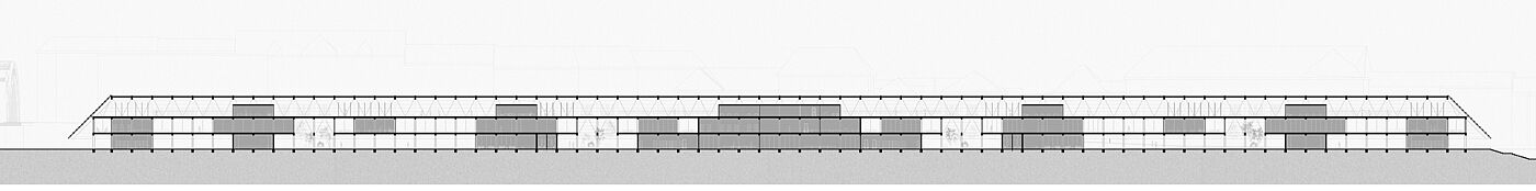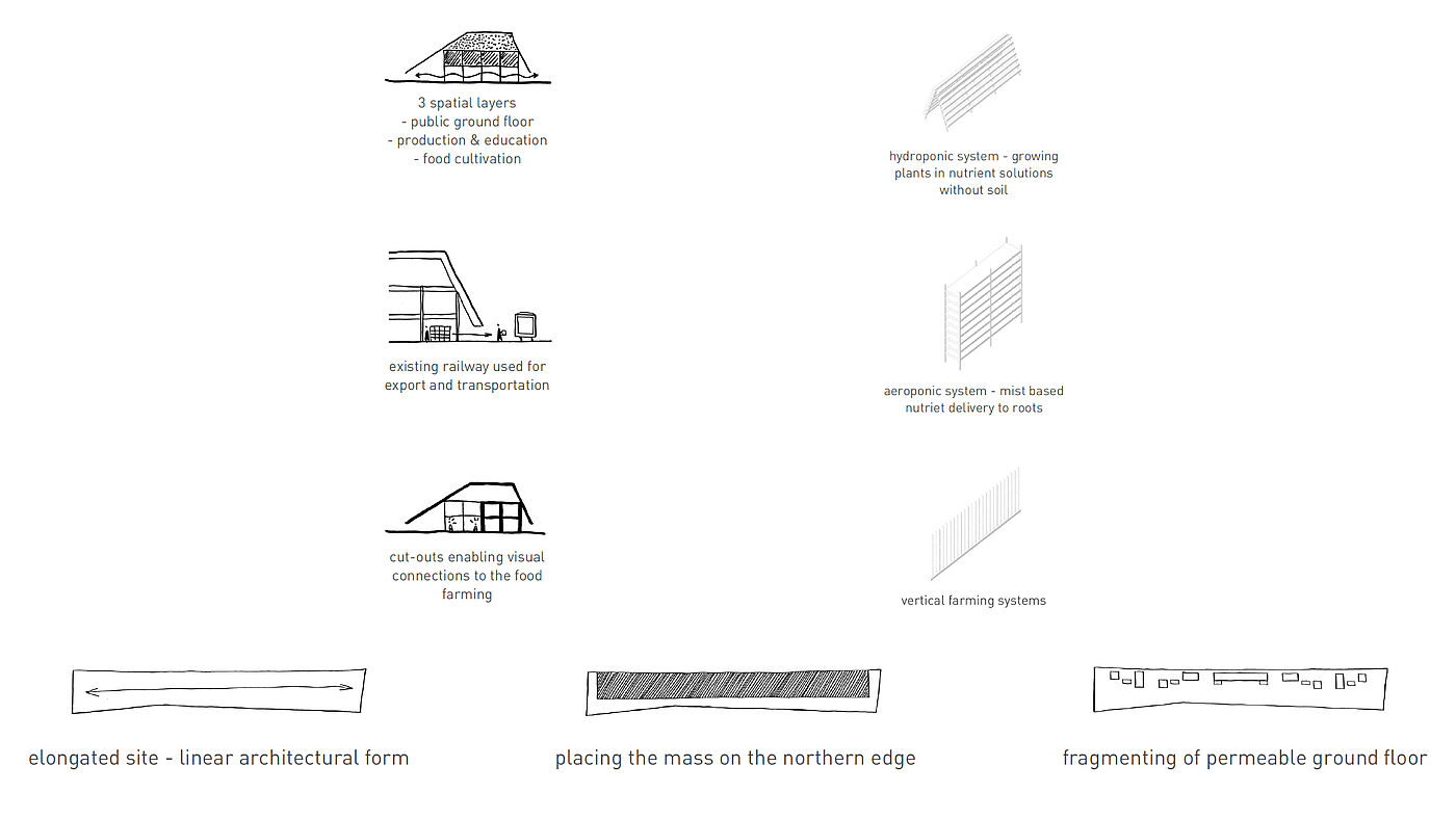 The long, narrow site next to the railway is treated as both physical and conceptual condition. Following the logic of infrastructural landscapes, the project is conceived as a low, horizontal and continuous system that organizes flows of matter, energy and people. Architecture is understood as a productive field rather than an object.