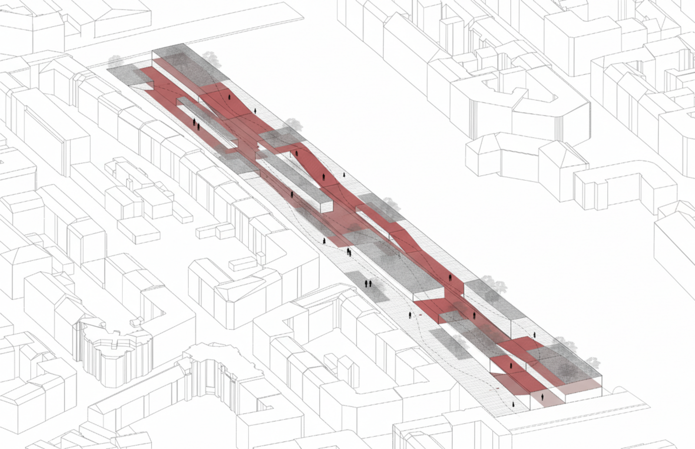 The increasing height creates a clear separation from the railway tracks, while framed views establish visual connections between visitors and the tracks in both the interior and exterior spaces, turning the infrastructure into an active part of the spatial experience.