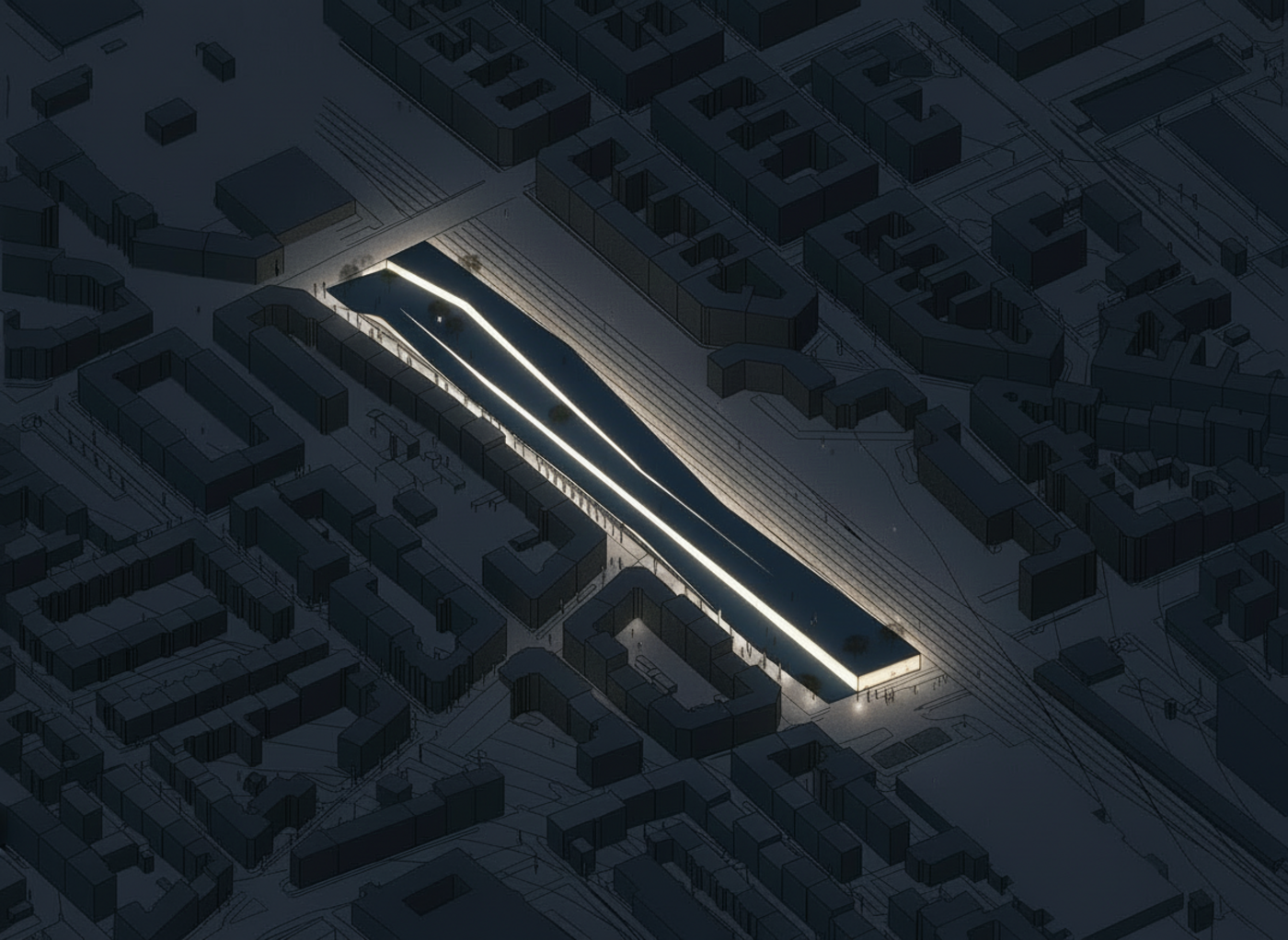 The infrastructure integrates into the surroundings like a ramp, connecting the lower street with the Teterower Bridge. In darkness, the landscape structure is highlighted through illumination, emphasizing the upper circulation. The nighttime lighting responds to the daylight conditions.