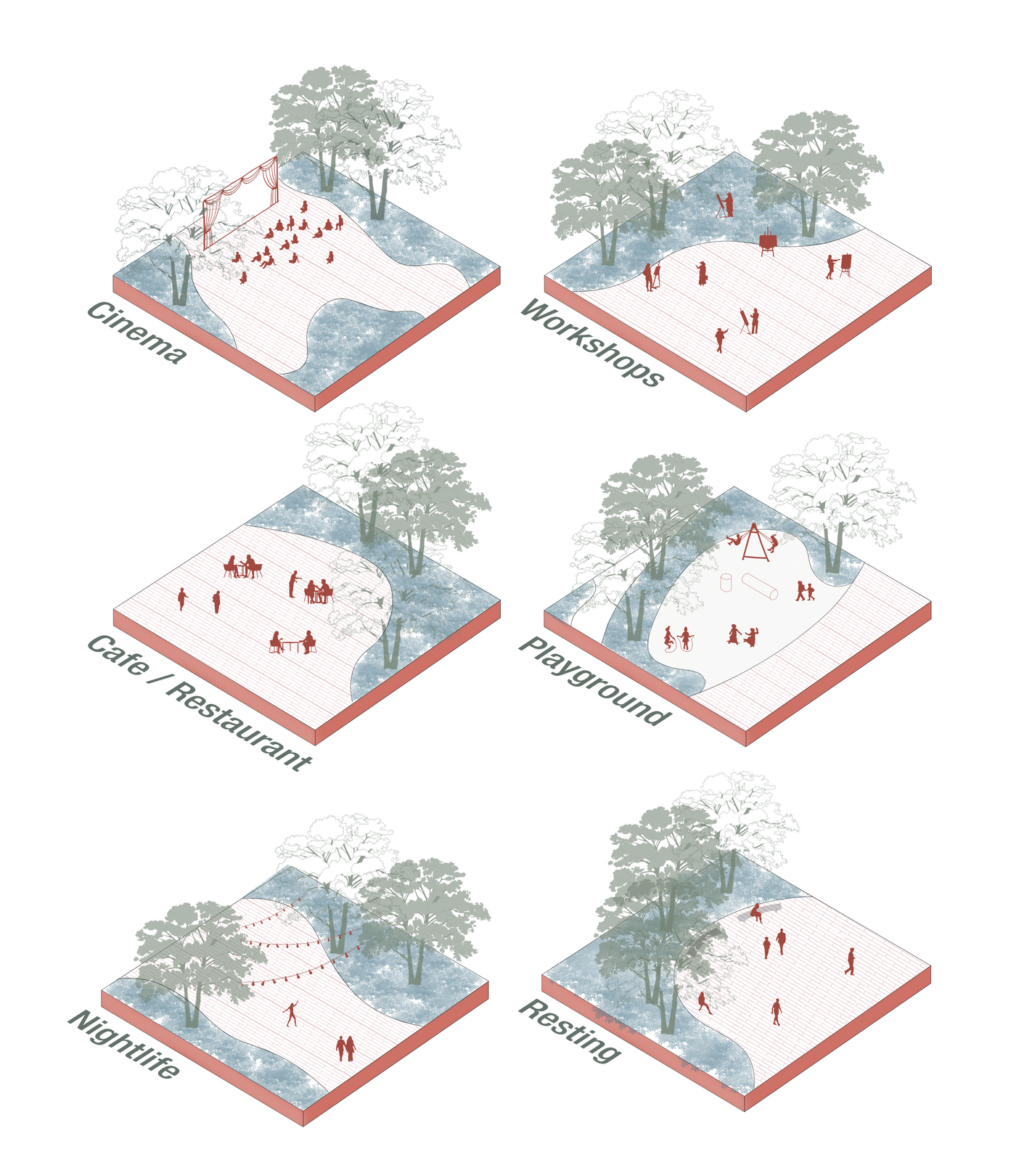 The ramp functions as both circulation and space of inhabitation, hosting temporary use. It becomes an open platform where different generations and diverse groups meet, interact, and share space. Nature intertwines with infrastructure. Levels dissolve, creating a space of plants and living systems. The infrastructure transforms into a living organism. The structure merges with nature, becoming part of the landscape, harmoniously integrating while filling gaps in the topography.