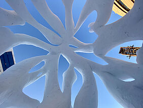 Die beiden Skulpturen aus Schnee greifen die Bedeutung in formal ganz unterschiedliche Weise auf und versuchen diese bemerkenswerten Symbiosen sichtbar und erfahrbar zu machen. Die Skulpturen stehen in Resonanz zueinander und dem sie umgebenden modernen urbanen Raum. Sie schaffen auf poetische Weise einen regionalen, kulturellen Bezug. Sie sind begehbare Orte der Begegnung und des Verweilens, an denen man über die Vergangenheit und unsere gemeinsame Zukunft nachdenken kann.