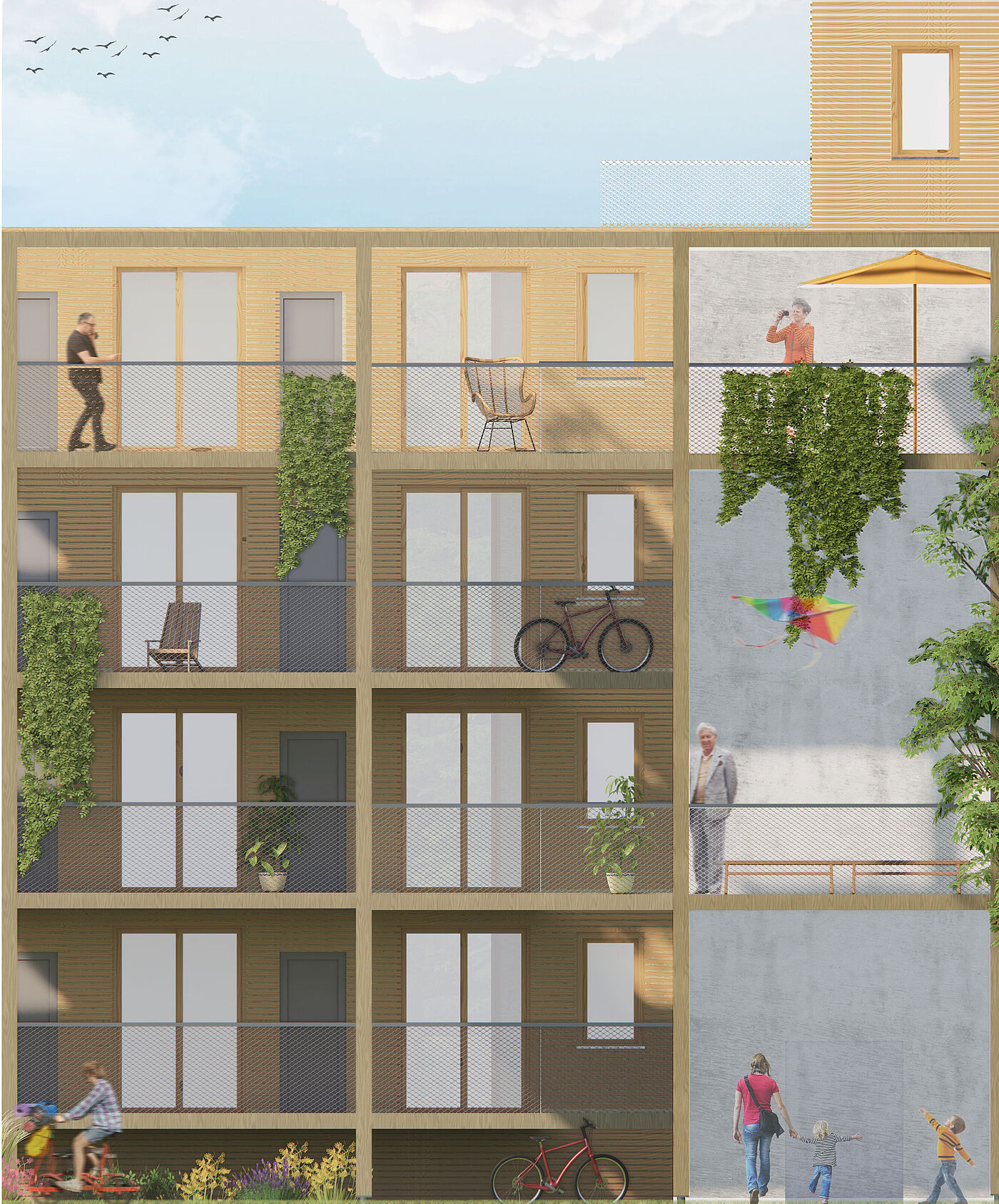 Im Entwurf „Neues Leben 4.0“ geht es um die Modernisierung und Anpassung von Plattenbauten an heutige Anforderungen. Das Projektgebiet, ein Teil der John-Brinckmann-Siedlung in Goldberg, soll durch neue städtebauliche Elemente, wie die Weiterverwendung von Bauteilen, Rückbau und Nachverdichtung